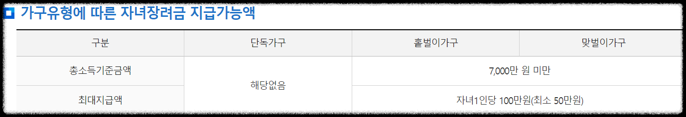 저소득 가구의 자녀양육을 지원하기 위해 총소득(부부합산) 7,000만원 미만이면서 부양자녀(18세 미만)가 있는 경우 1인당 최대 100만원(최소50만 원)을 지급하는 제도로 총소득 기준을 제외한 나머지 수급요건은 근로장려금과 동일합니다.